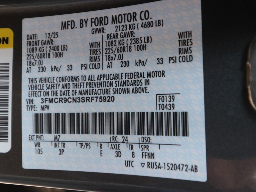 • VIN # 3FMCR9CN3SRF75920
