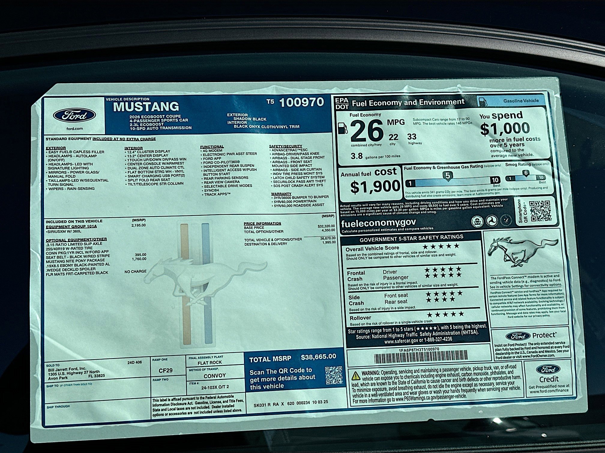 Shadow Black 2026 Ford Mustang EcoBoost RWD 10-Speed Automatic EcoBoost 2.3L I4 GTDi DOHC Turbocharged VCT ABS brakes, Alloy wheels, Compass, Electronic Stability Control, Front dual zone A/C, Illuminated entry, Low tire pressure warning, Remote keyless entry, Traction control.